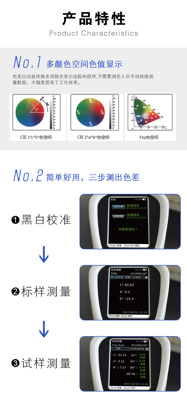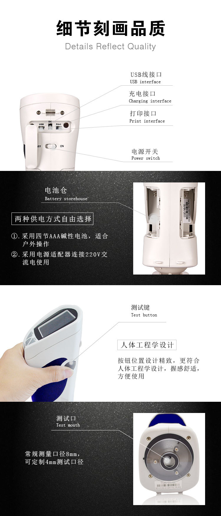 儀器內(nèi)置日本的傳感器,美G的信息處理芯片;保證了光信號(hào)的準(zhǔn)確傳輸和電信號(hào)的穩(wěn)定,為儀器的精度和重復(fù)性保駕護(hù)航,顯示精度0.01,重復(fù)精度△E標(biāo)準(zhǔn)偏差值0.08。