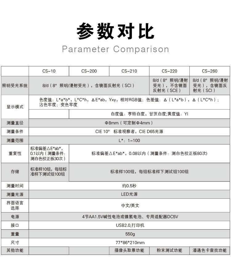 CS-210精密色差儀,廣泛應(yīng)用于塑膠、印刷、油漆油墨、紡織、印染服裝等行業(yè)的顏色管理*域,根據(jù)CIE色空間測(cè)量樣品色值L*a*b、L*c*h,與被測(cè)樣品的色差△E以及 △Lab值。