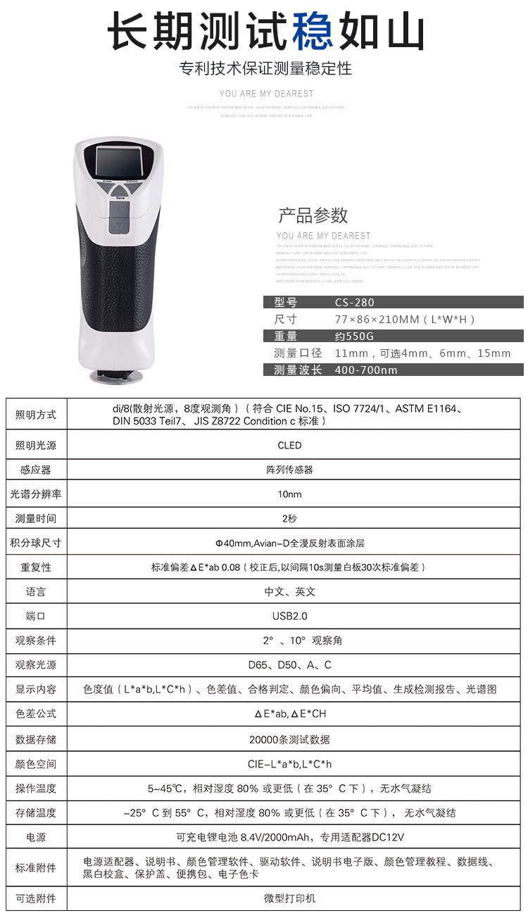 分光式色差儀CS-280采用分光式原理測(cè)量顏色色差,廣泛應(yīng)用于塑膠、印刷、油漆油墨、紡織、印染服裝等行業(yè)的顏色管理*域,根據(jù)CIE色空間測(cè)量樣品色值L*a*b、L*c*h,與被測(cè)樣品的色差△E以及 △Lab值。