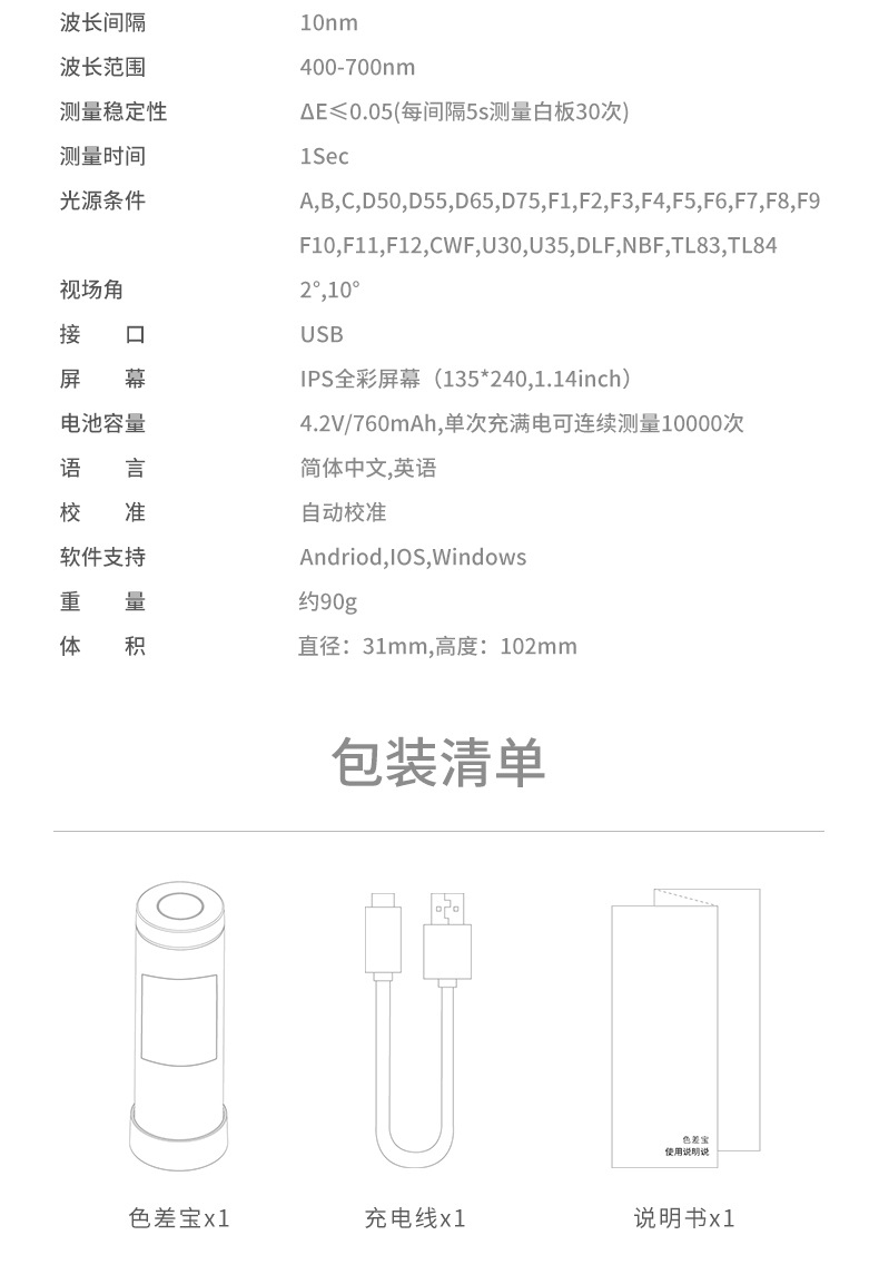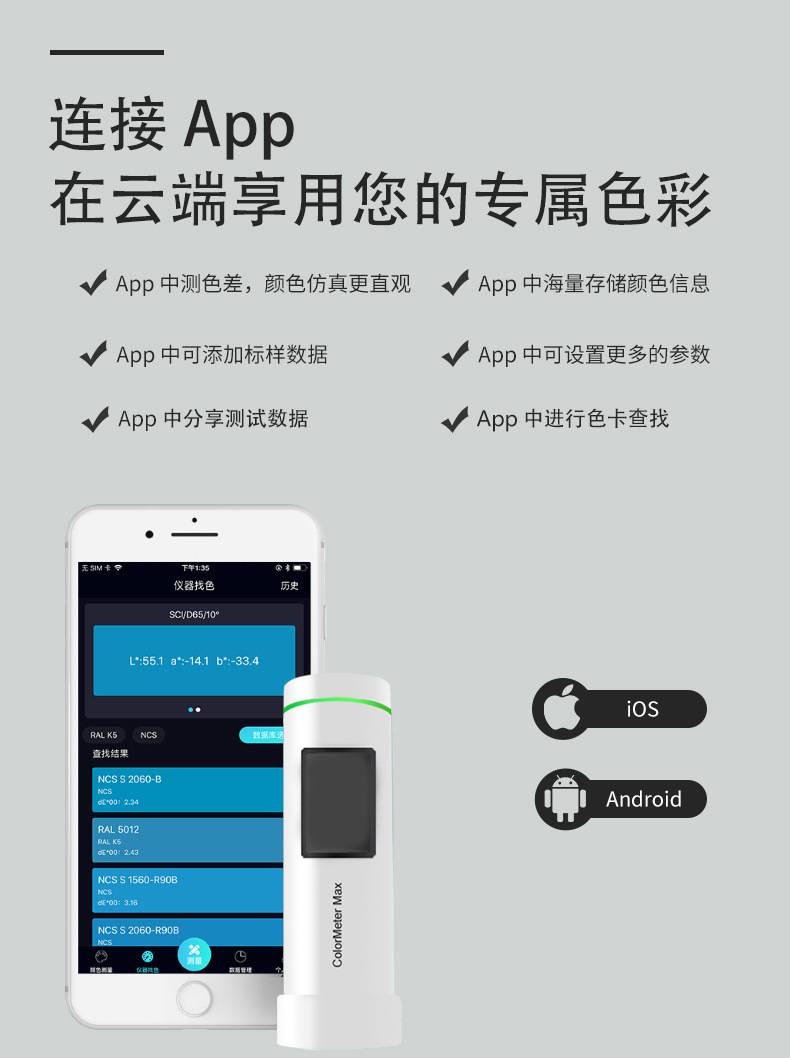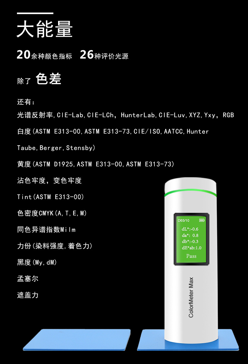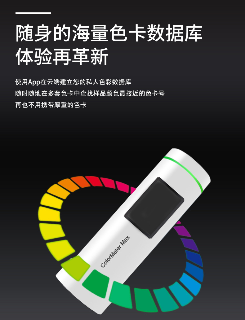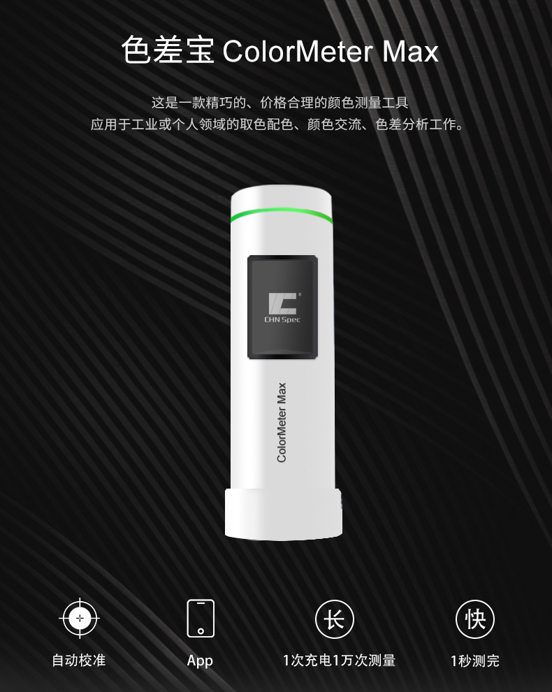 色差寶ColorMeter MAX是色差寶系列的增強版儀器,是色差儀*域一款強大的測色工具,優秀的性能配置,讓色彩測量更準確;與安卓或IOS設備無線連接,極大的拓展了顏色測量儀器的應用邊界;它將帶您進入色彩管理新世界,可替代印刷、涂料、紡織等色卡,實現顏色讀取、色卡查找功能;儀器可過G家二級計量,測量穩定性小于等于0.05,優于色差寶ColorMeter Pro。